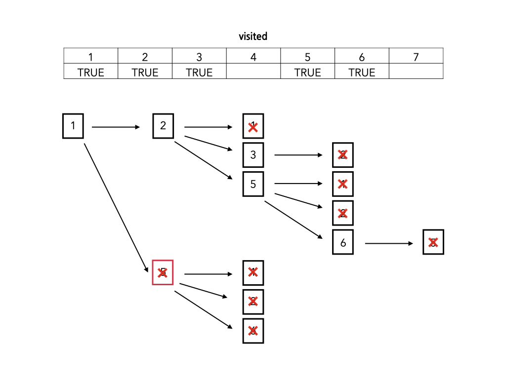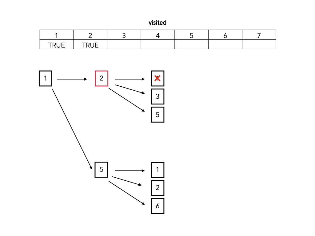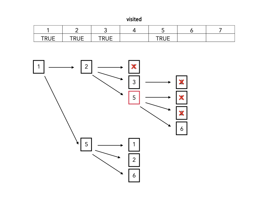 6은 5와 연결되어 있지만 5는 visited 배열에 true 로 되어 있으므로 탐색을 종료 한다.