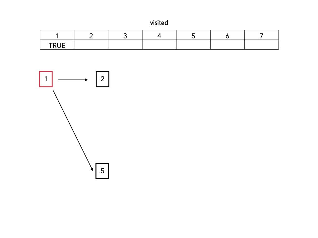 1은 2 와 5와 연결 되어 있다. 탐색은 순차적으로 하므로 1다음에 탐색할 노드는 2이다.