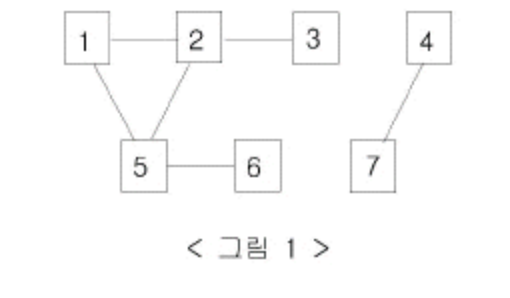 예를 들어 7대의 컴퓨터가 <그림 1>과 같이 네트워크 상에서 연결되어 있다고 하자. 1번 컴퓨터가 웜 바이러스에 걸리면 웜 바이러스는 2번과 5번 컴퓨터를 거쳐 3번과 6번 컴퓨터까지 전파되어 2, 3, 5, 6 네 대의 컴퓨터는 웜 바이러스에 걸리게 된다. 하지만 4번과 7번 컴퓨터는 1번 컴퓨터와 네트워크상에서 연결되어 있지 않기 때문에 영향을 받지 않는다.