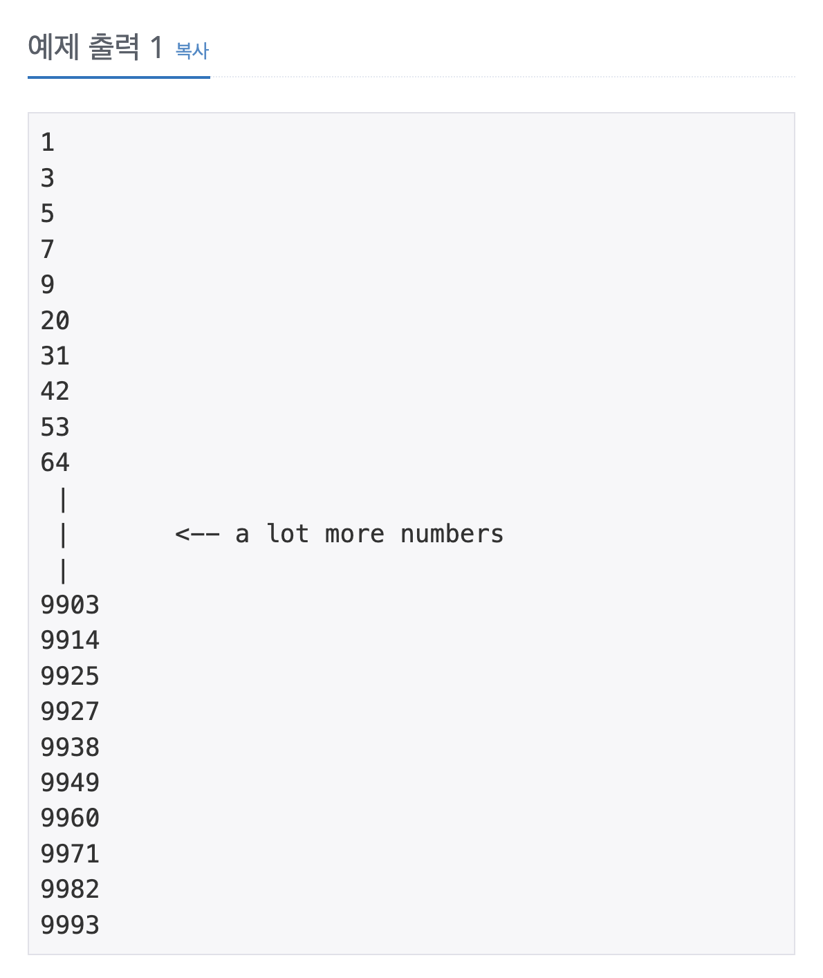 생성자가 없는 숫자를 셀프 넘버라고 한다. 100보다 작은 셀프 넘버는 총 13개가 있다. 1, 3, 5, 7, 9, 20, 31, 42, 53, 64, 75, 86, 97